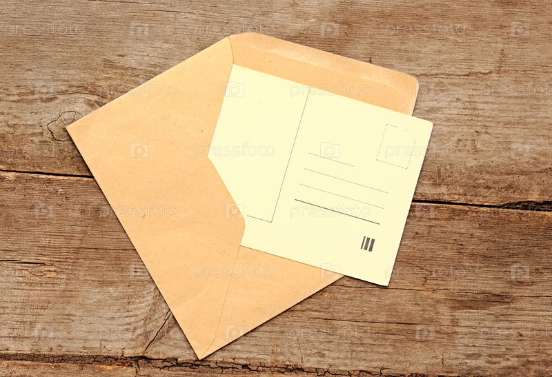 Старый конверт с открыткой на деревянном фоне
