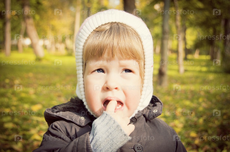 Светловолосая девочка держит палец во рту