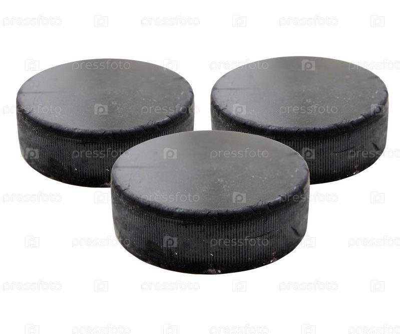 Три старых черных хоккейных шайбы, изолированных на белом фоне