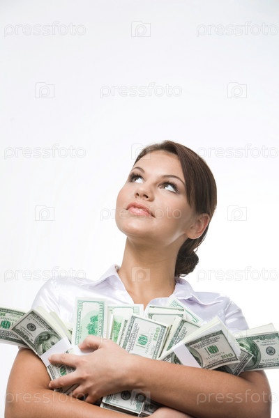 Портрет очаровательной леди, держащей долларовые купюры и смотрящей вверх