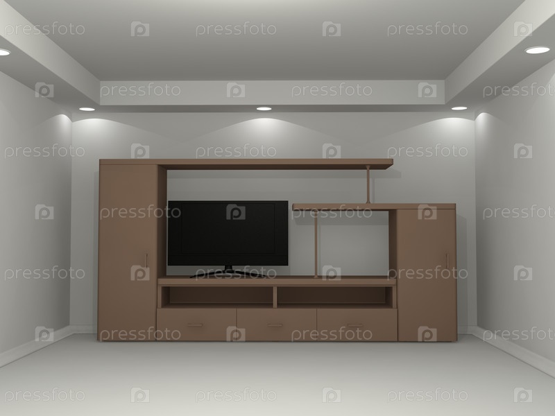 Плоский телевизор стоит на подставке в серой комнате, объем 3d