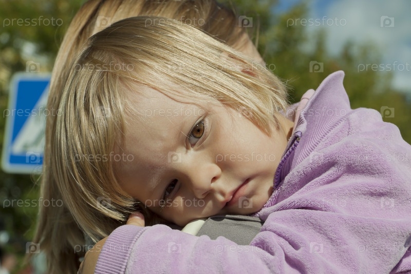 Маленький ребенок с грустными глазами обнимает маму, которая переходит через дорогу