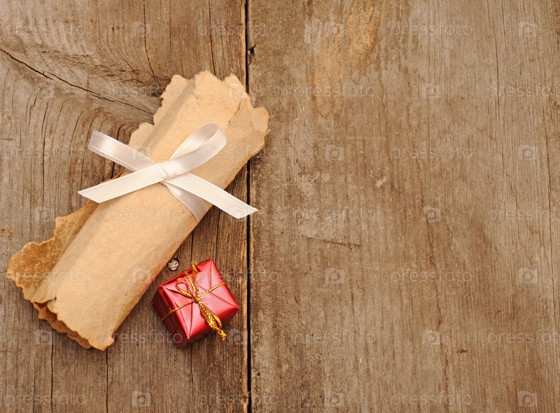 Свиток с белой лентой и подарочная коробочка на деревянном фоне