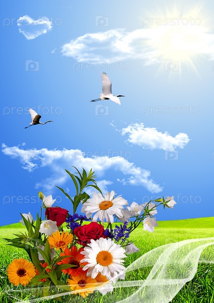 Свадебный букет цветов на фоне летней поляны