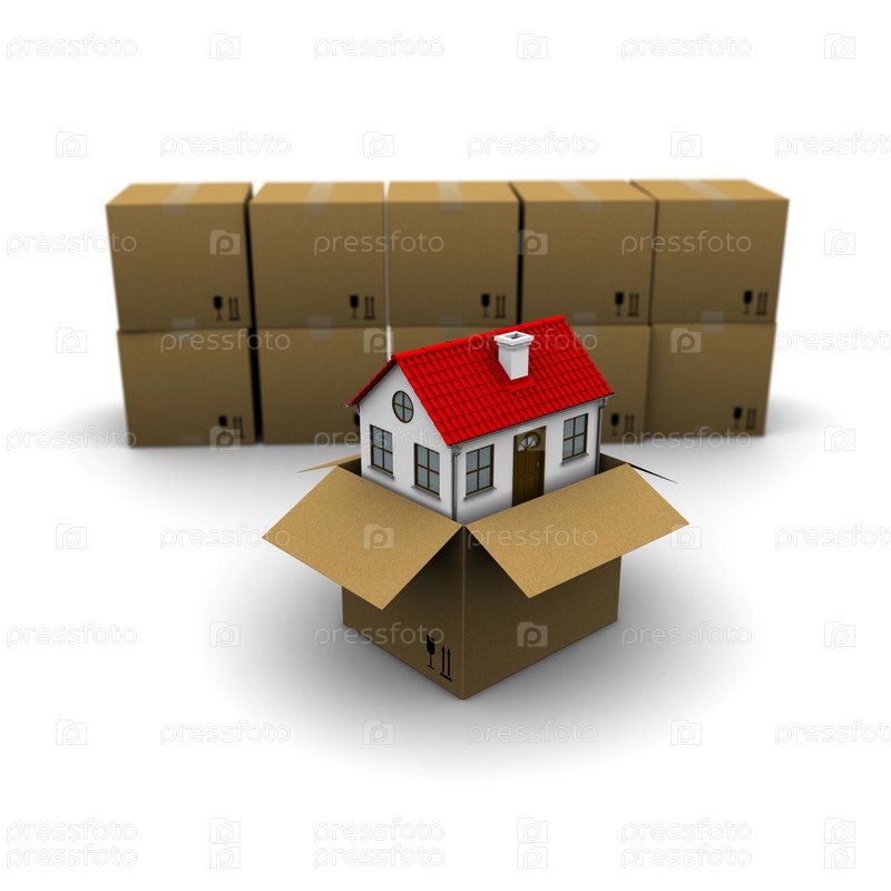 Картонные коробки и дом с красной крышей в одной из них