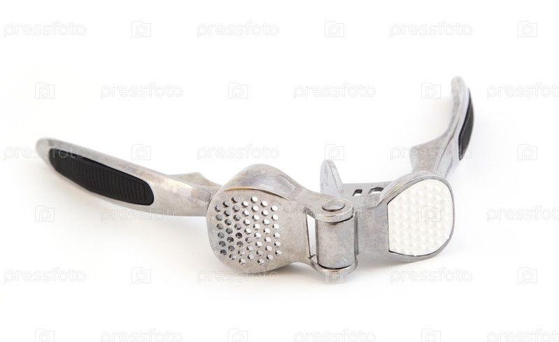 Металлические пресс для чеснока на белом фоне