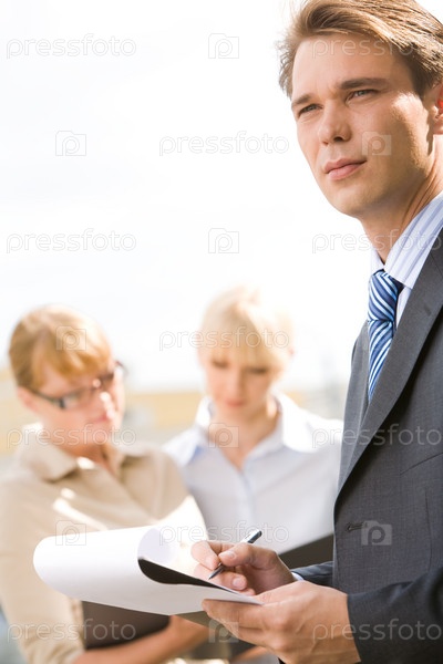 Портрет серьезного босса, держащего ручку над бумагой с рабочими леди на заднем плане