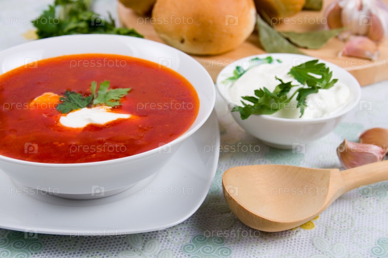 Борщ - русский традиционный суп из овощей и мяса со сметаной