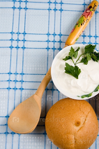 Сметана, булочка и деревянная ложка на клетчатой скатерти