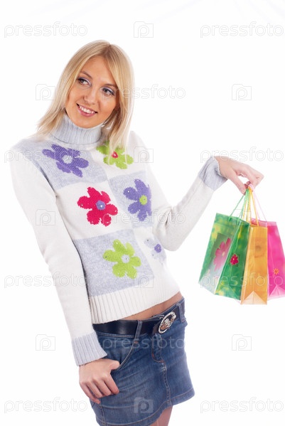 Молодая женщина с пакетами для покупок на изолированном белом фоне