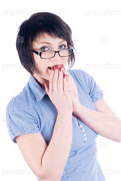Портрет шокированной женщины на белом фоне