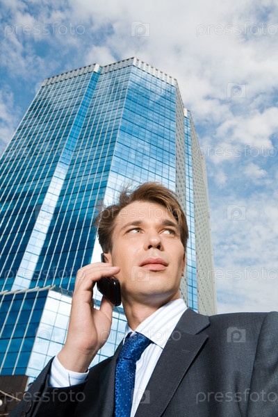 Портрет успешного бизнесмена, звонящего по сотовому телефону и оглядывающегося в сторону