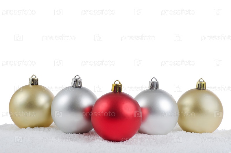 Елочные украшения в снегу, изолированы на белом