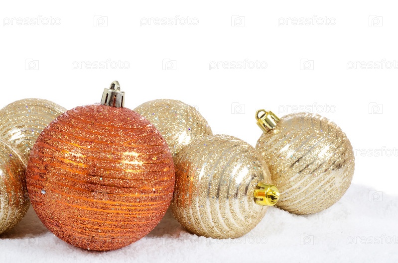 Елочные украшения в снегу, изолированы на белом