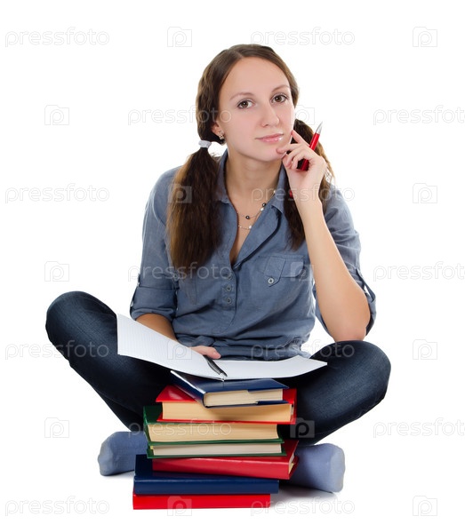 Девушка с книгами, изолирована на белом