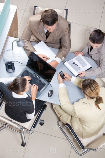 Вид сверху на рабочее место, где бизнес-команда сидит вокруг него и работает