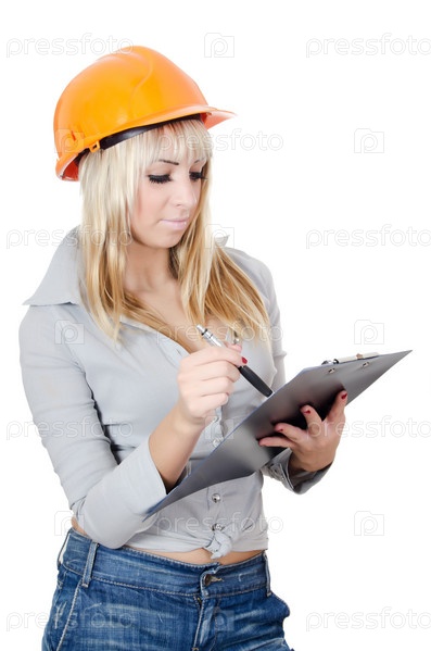 Девушка в строительной каске с планшетом