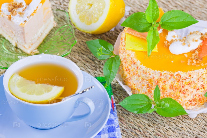 Чашка чая с лимоном и вкусный, красиво оформленный торт на столе