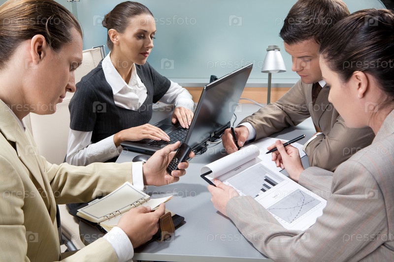 Фото исполнительных бизнес-партнеров вокруг стола, взаимодействующих друг с другом