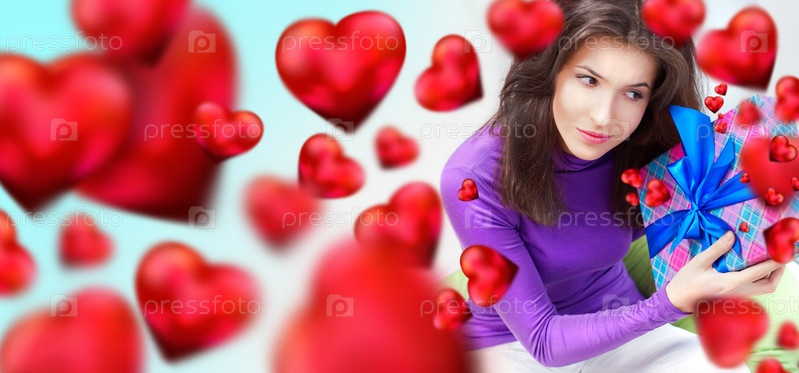 Радостная женщина открывает подарок, сидя на кресле-мешке дома и красивые красные сердца летают вокруг. Концептуальный плакат ко дню Святого Валентина