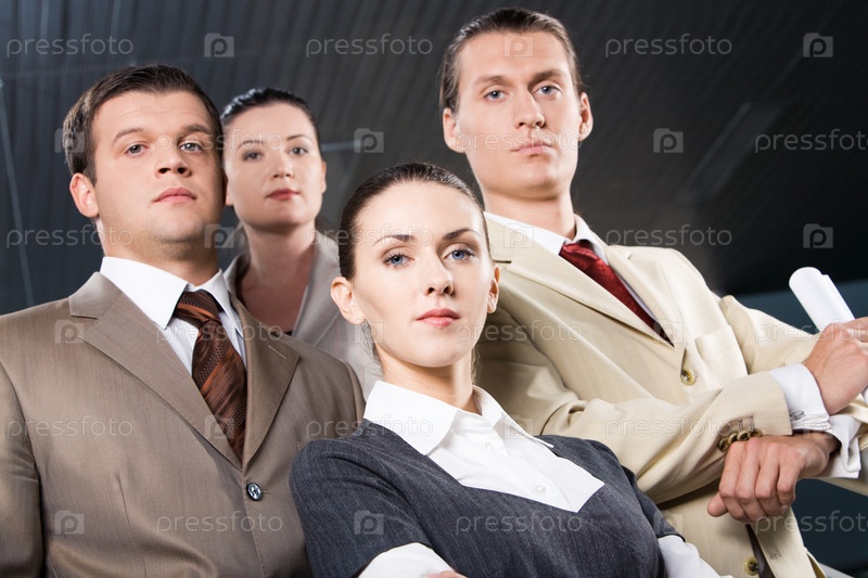 Серьезные люди в деловых костюмах уверенно смотрят в камеру