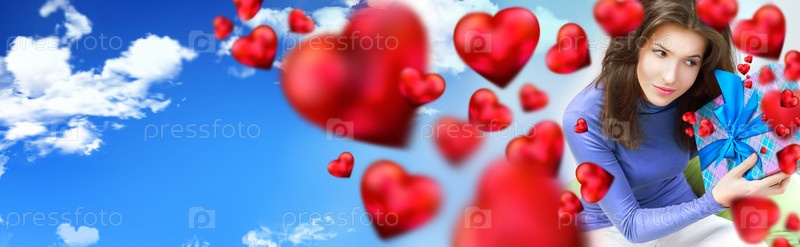 Радостная женщина открывает подарок, сидя на кресле-мешке дома и красивые красные сердца летают вокруг. Концептуальный плакат ко дню Святого Валентина