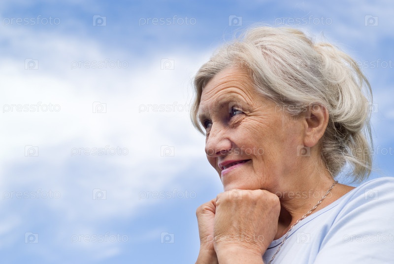 Красивая пожилая женщина на фоне голубого неба
