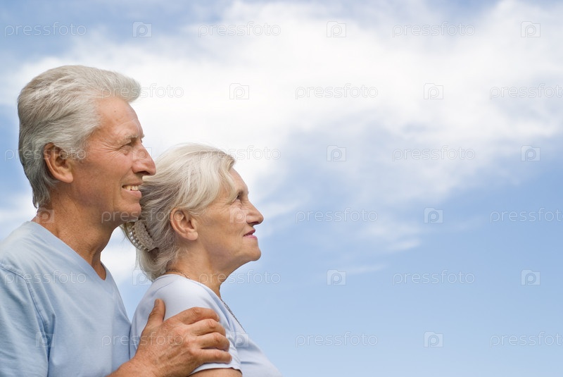 Счастливая пожилая пара на фоне голубого неба