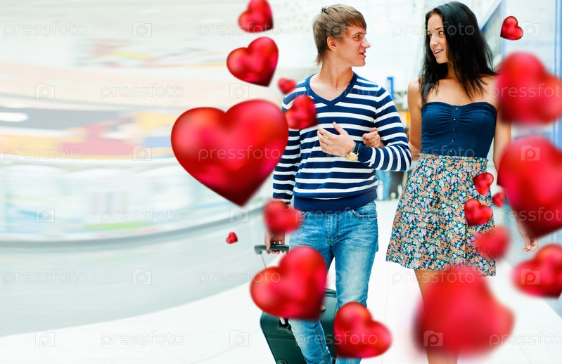 Портрет молодой пары, идущей вместе в зале аэропорта с их багажом. Они очень счастливы улететь в теплые страны на праздник. Сердца вокруг них. Концепция к дню Св.Валентина