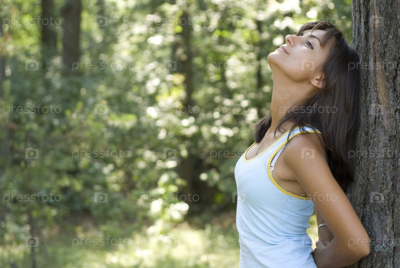 Портрет милой девушки прислонившейся к дереву