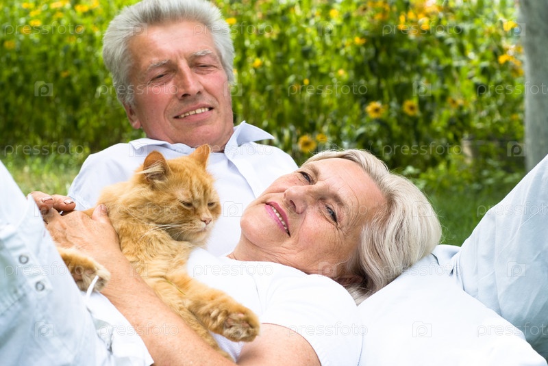 Счастливая пожилая пара отдыхает с кошкой в летнем парке