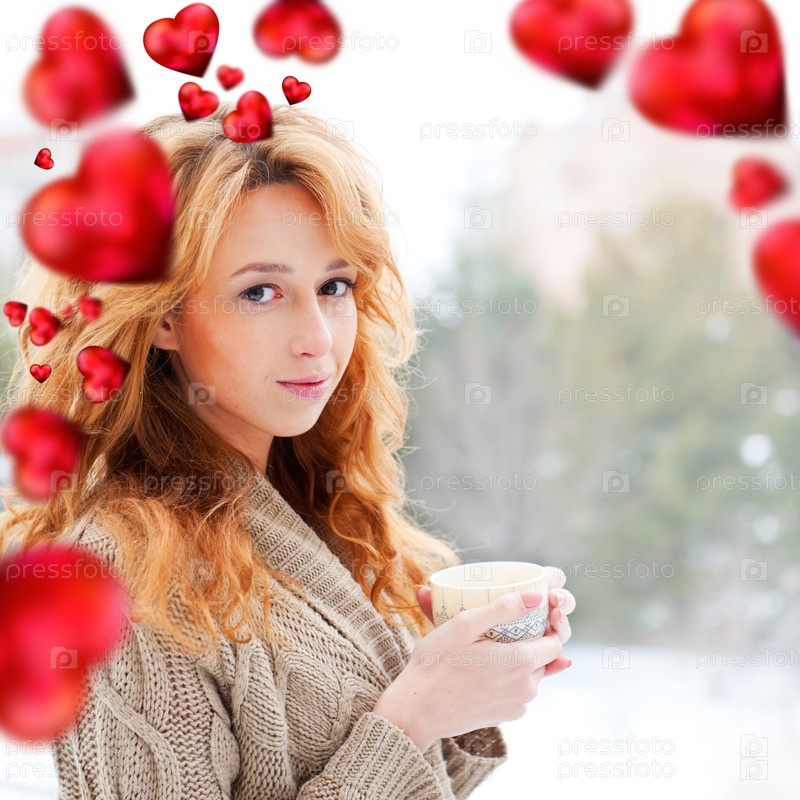 Портрет красивой девушки с рыжими волосами, пьющей кофе на зимнем фоне. Красные сердца летают вокруг нее. Концепция к дню Св. Валентина