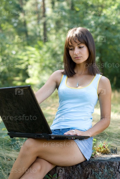 Привлекательная девушка сидит на пеньке с ноутбуком