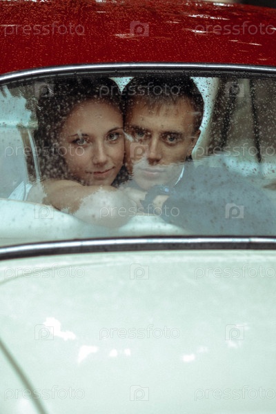 Влюбленные смотрят в запотевшее, с капельками дождя окно машыны