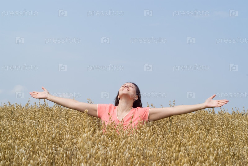 Счастливая молодая женщина сидит во ржи, раскинув руки