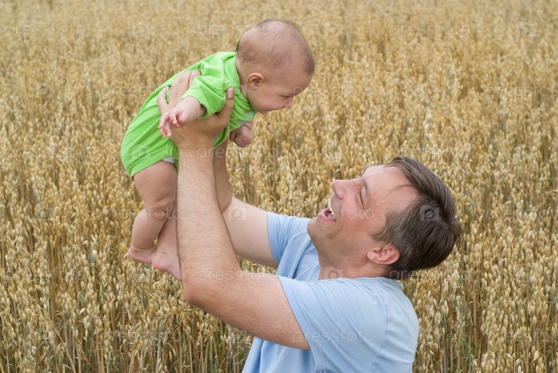 Папа с новорожденным ребенком на прогулке в поле