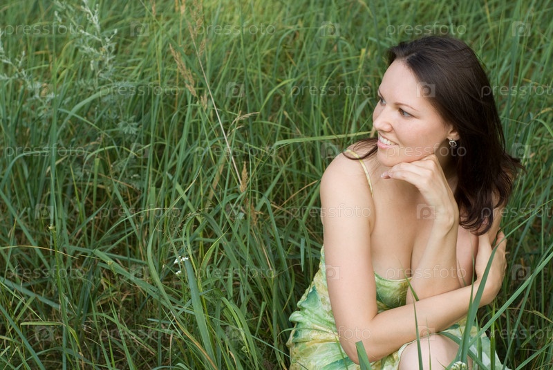 Девушка сидит в зеленой траве
