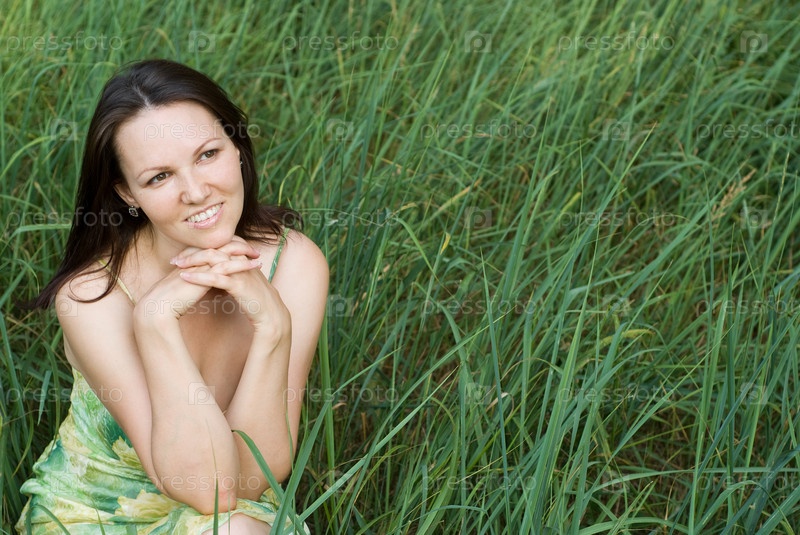 Красивая девушка сидит в зеленой траве и мечтает