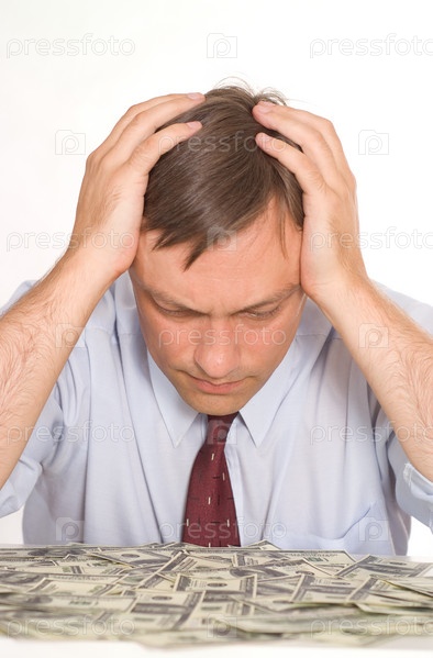 Озадаченный бизнесмен перед рассыпанными деньгами