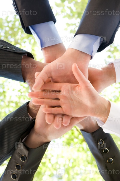 Снизу вид людей, держащих друг друга за руки на фоне зеленой листва