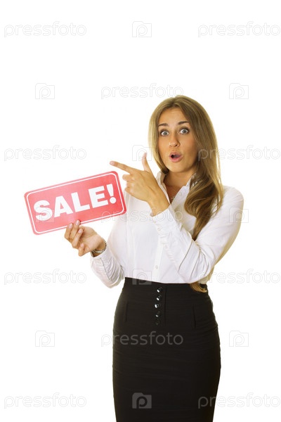 Бизнес-леди стоит с карточкой распродажа