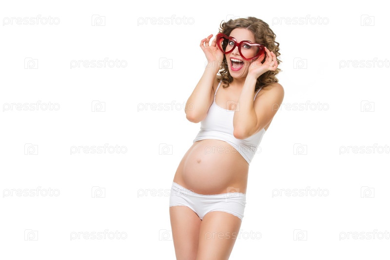 Веселая беременная женщина в очках
