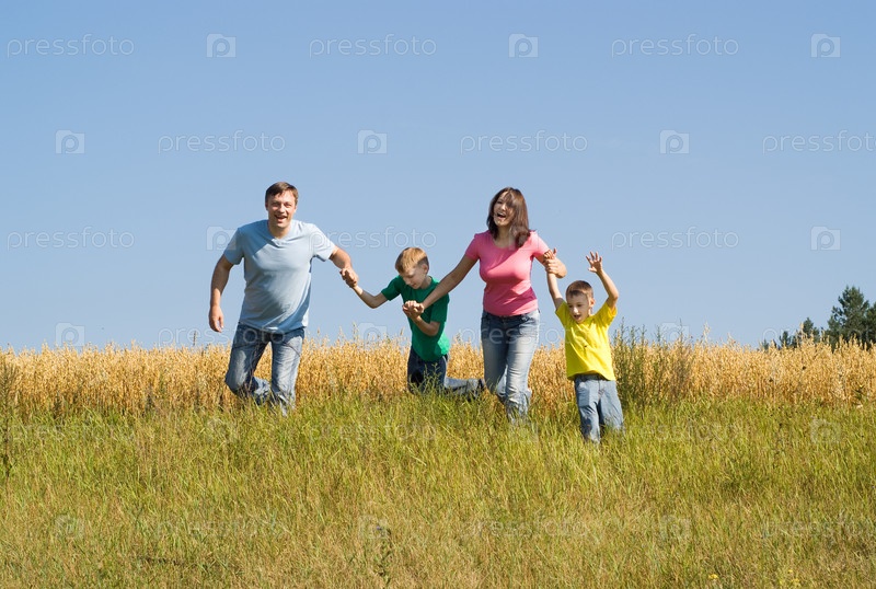 Счастливая семья с двумя мальчиками на прогулке в поле