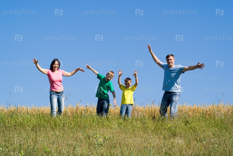 Портрет счастливой семьи из четырех человек на природе