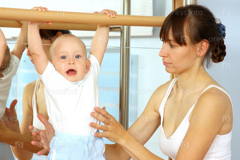 Мать и ребенок занимаются с инструктором в спортивном зале