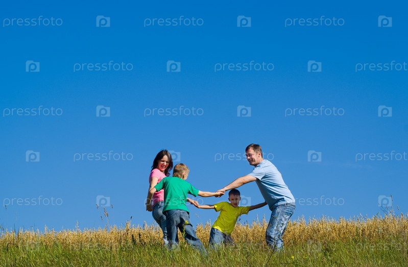 Веселая семья из четырех человек отдыжает на природе