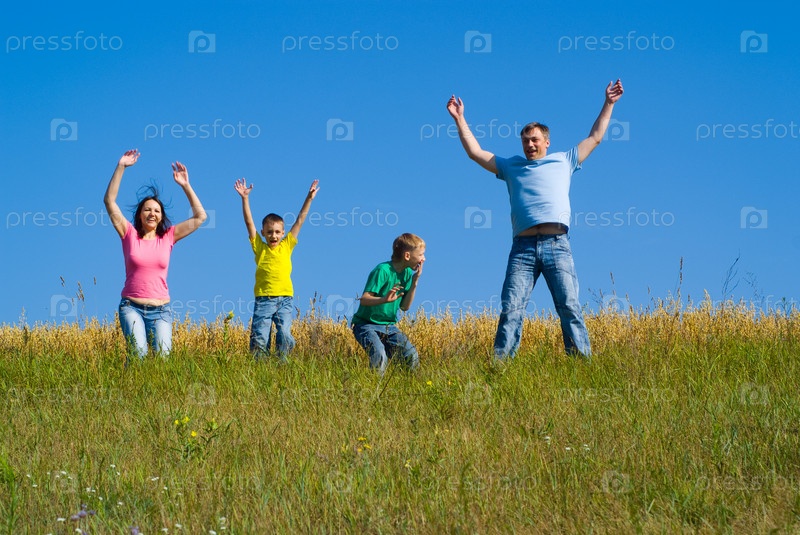 Счастливая семья с двумя сыновьями на прогулке в поле