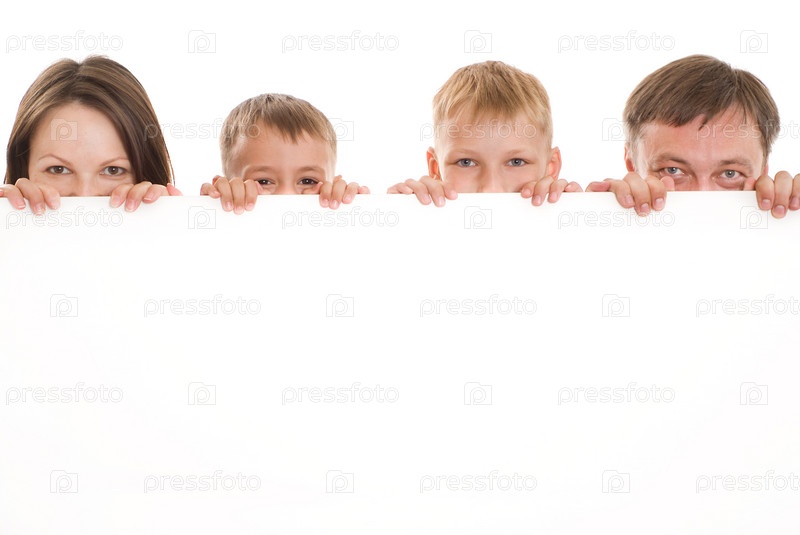 Дети и родители выглядывают из-за плаката