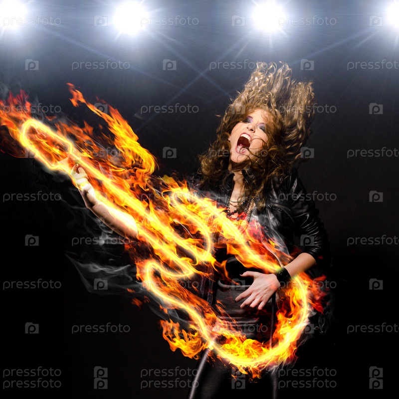 Девушка в стиле рок-н-ролл играет на огненной гитаре
