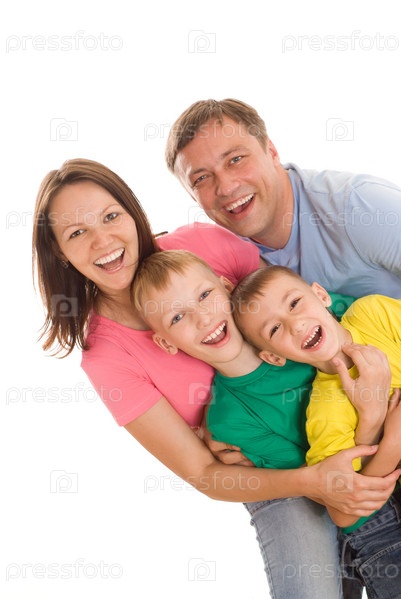 Счастливые родители с двумя сыновьями на белом фоне